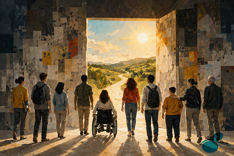 Il soggetto centrale è costituito da un’apertura rettangolare incorniciata da pareti che sembrano costituite da un collage di frammenti colorati e materici. Il gruppo comprende uomini, donne e bambini di diverse età. Al centro del gruppo spicca una persona in sedia a rotelle. Oltre il portale si apre una strada che si snoda attraverso colline verdi sotto un sole splendente, evocando un senso di speranza, libertà e un cammino verso il futuro.