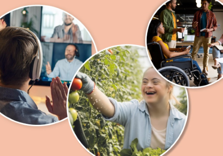 Collage composto da tre immagini circolari. A sinistra: Una persona di spalle indossa delle cuffie e partecipa a una videochiamata di gruppo. Al centro: Una giovane donna con sindrome di Down sorride radiosa mentre lavora in un orto o in una serra. A destra: Un gruppo di colleghi interagisce in un ufficio moderno. In primo piano, una donna in sedia a rotelle partecipa attivamente alla conversazione con altri due uomini.