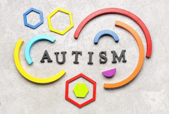 autism-realizzazione-grafica Essa contiene la parola inglese “autism” e alcuni elementi decorativi geometrici colorati.