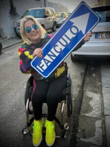 Un’attivista in sedia a rotelle, Cinzia Chiarini, stanca di venire discriminata, manifesta il proprio dissenso in modo fantasioso.
