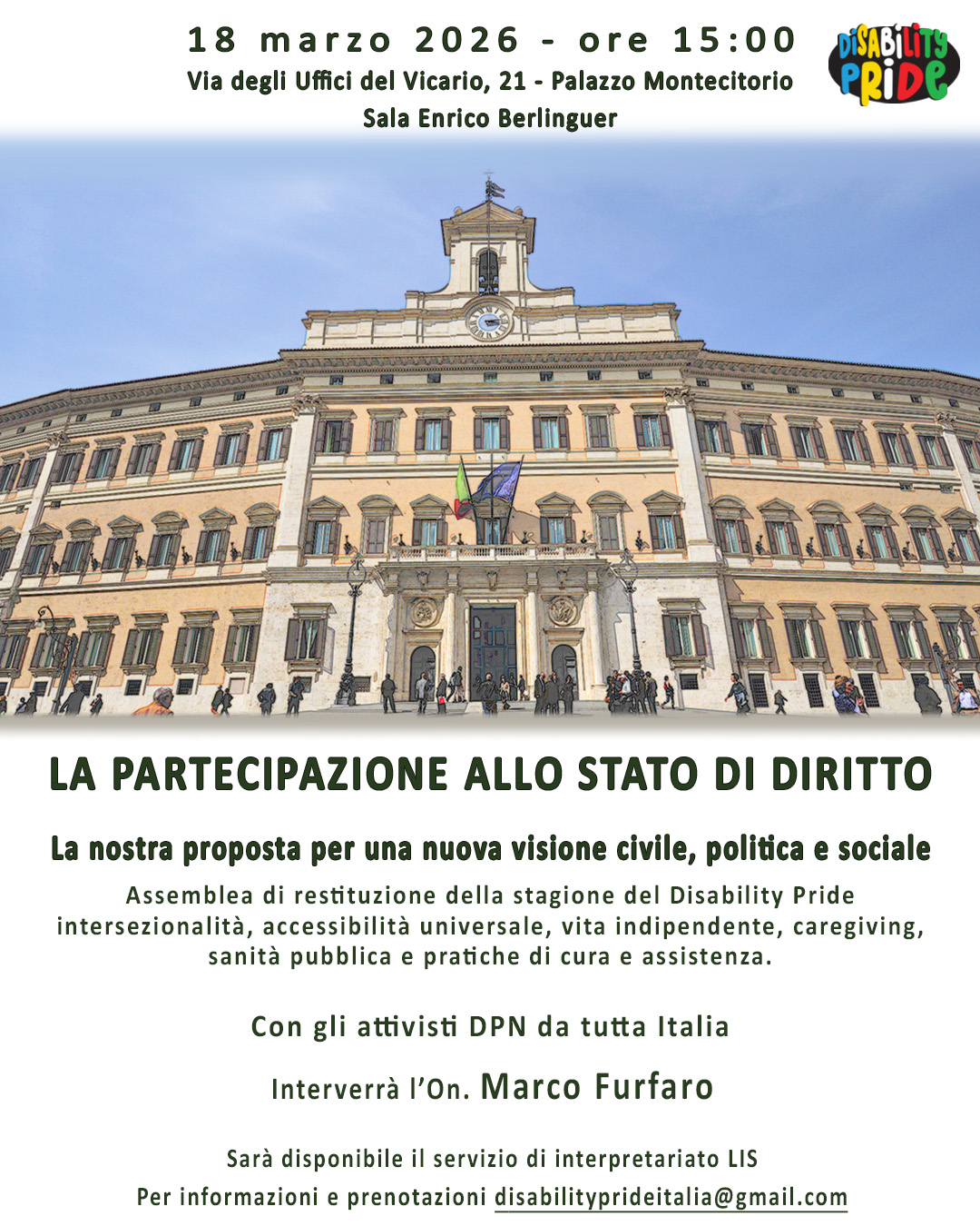 Disability-Pride-Network-incontro-2026-03-18-Locandina Essa è illustrata con la foto della facciata anteriore di Palazzo Montecitorio.