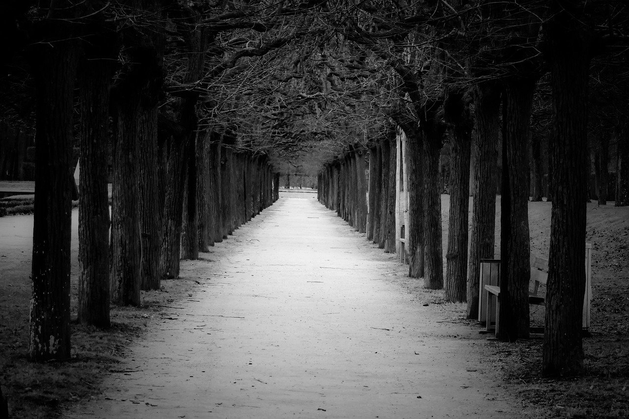 Fotografia in bianco e nero che ritrae un sentiero sterrato fiancheggiato da due file simmetriche di alberi spogli, che creano una linea guida verso un punto focale lontano. Sulla destra, verso il centro, è visibile una panchina vuota. I toni scuri e il contrasto elevato conferiscono all’immagine un’atmosfera malinconica.