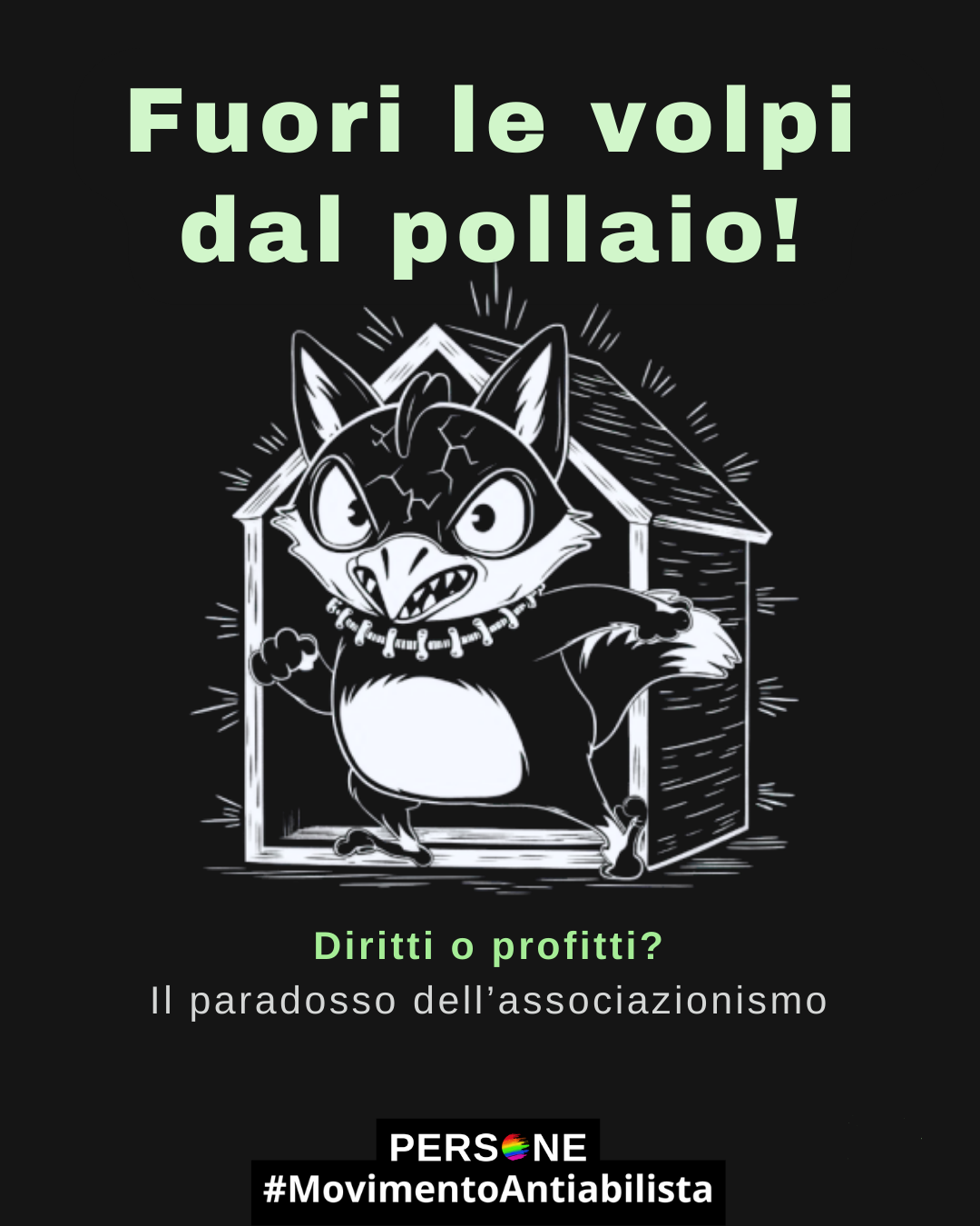 Essa è ideata su sfondo nero, contiene la denominazione della campagna, l’indicazione dei soggetti proponenti, la scritta “Diritti o profitto? Il paradosso dell’associazionismo”, ed è illustrata con il disegno in bianco e nero di una volpe dall’espressione alquanto aggressiva che salta fuori da una sorta di casetta (che dovrebbe rappresentare un pollaio).