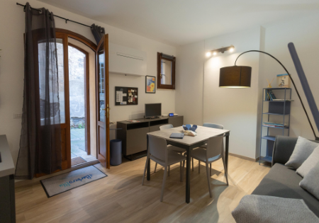 L’immagine mostra l’interno di un appartamento moderno e accogliente, probabilmente un monolocale o una zona giorno open space.