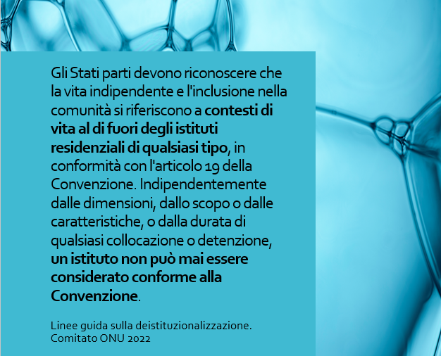 Il passaggio è il seguente: «Gli Stati parti devono riconoscere che la vita indipendente e l’inclusione nella comunità si riferiscono a contesti di vita al di fuori degli istituti residenziali di qualsiasi tipo, in conformità con l’articolo 19 della Convenzione. Indipendentemente dalle dimensioni, dallo scopo o dalle caratteristiche, o dalla durata di qualsiasi collocazione o detenzione, un istituto non può mai essere considerato conforme alla Convenzione».