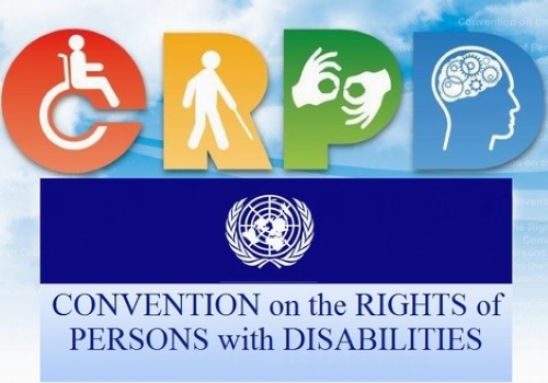 L’immagine si compone di tre parti: nella parte superiore è rappresentata la sigla “CRPD” formata da quattro lettere colorate. Ogni lettera incorpora un simbolo diverso che rappresenta una forma di disabilità o accessibilità. Nella parte centrale è raffigurato il logo ufficiale delle Nazioni Unite (ONU) in posizione centrale e su sfondo blu. Nella parte inferiore, è scritta, su sfondo azzurro chiaro, la denominazione della Convenzione in inglese: “CONVENTION on the RIGHTS of PERSONS with DISABILITIES”.