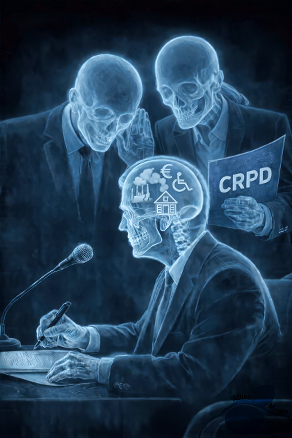 La scena mostra tre figure umane in giacca e cravatta, rappresentate come scheletri traslucidi in un’ambientazione che sembra una conferenza stampa o un incontro politico. Un uomo seduto sta firmando un documento mentre parla al microfono. Dietro di lui, due figure gli sussurrano all’orecchio e tengono in mano una cartella con la scritta “CRPD”. La CRPD sta per Convention on the Rights of Persons with Disabilities (Convenzione sui diritti delle persone con disabilità delle Nazioni Unite). All’interno del cranio dell’uomo seduto, si vedono simboli come il logo dell’euro (€), una casa e il simbolo internazionale della disabilità.