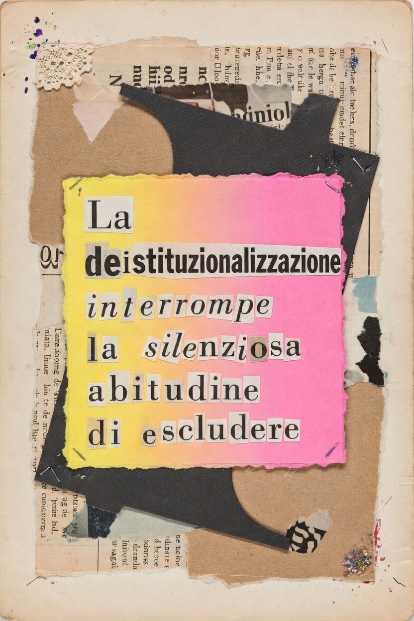 istituzionalizzazione-abitudine-di-escludere-grafica L’immagine mostra un collage artistico su carta realizzato con ritagli di giornale e carta colorata.