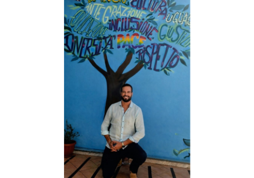 L’immagine mostra un uomo con la barba sorridente seduto davanti a un vivace murale su sfondo azzurro. Il murale rappresenta un grande albero stilizzato. Al posto delle foglie, i rami “sorreggono” diverse parole scritte in vari colori e stili, che richiamano valori sociali. Tra le parole leggibili in italiano ci sono: pace (al centro, in evidenza), integrazione, inclusione, rispetto, diversità e giustizia.