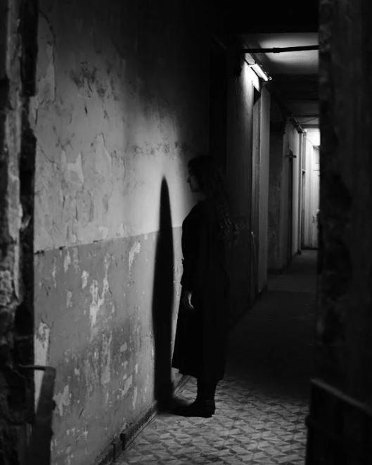 L’immagine è un’inquadratura in bianco e nero di una donna in piedi, col viso rivolto verso il muro, in un corridoio fatiscente, illuminato da una forte luce artificiale.