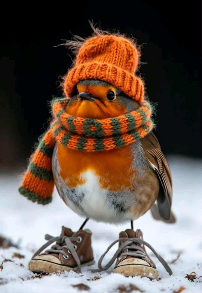 Nella foto è ritratto in un’ambientazione innevata con indosso un cappello e una sciarpa di lana arancioni e verdi, e scarpe da ginnastica.
