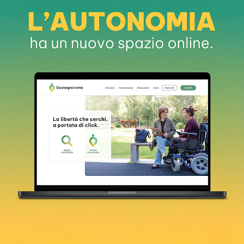 Sotto la scritta “L’autonomia ha un nuovo spazio digitale” è raffigurato un computer portatile aperto, sul cui schermo figura la schermata iniziale della piattaforma Sostegninrete.it
