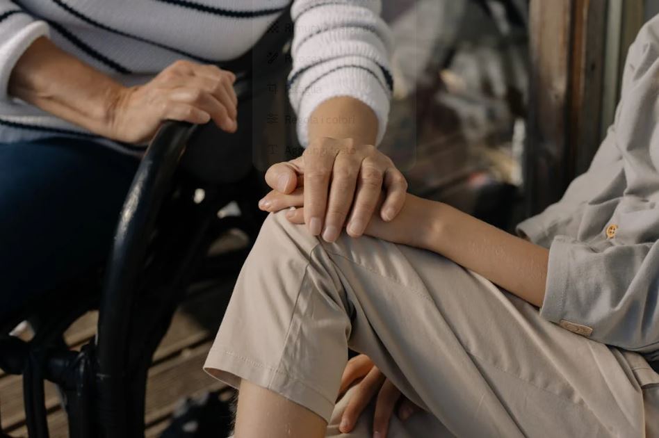 L’immagine cattura un momento di profonda vicinanza e supporto tra due persone. Una persona anziana, che indossa un maglione a righe bianche e nere, tiene teneramente la mano di una persona più giovane. La persona più giovane indossa abiti di colore neutro (beige/grigio chiaro) e sembra essere seduta. La sua mano è dolcemente racchiusa in quella della persona anziana. I volti delle due persone rimangono fuori dall’inquadratura.