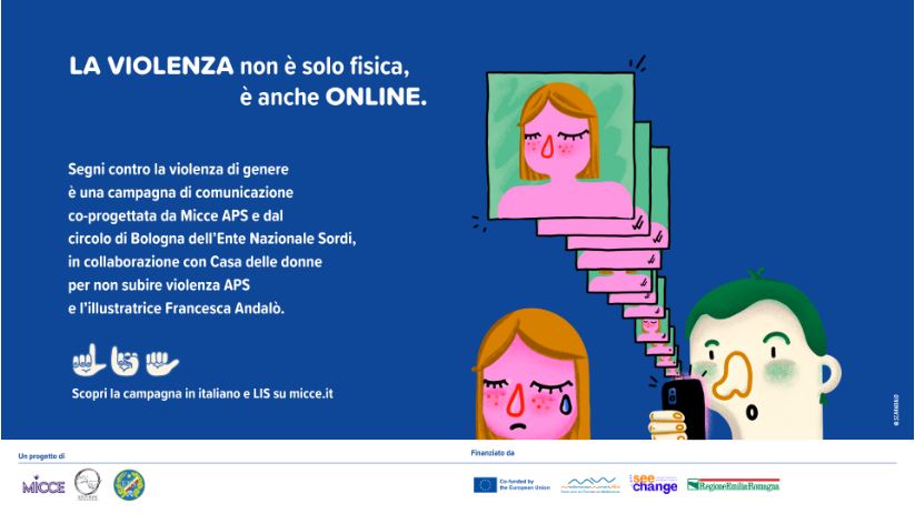 La tavola ha uno sfondo blu intenso e presenta un’illustrazione in stile fumetto. Il testo principale in alto recita: “LA VIOLENZA non è solo fisica, è anche ONLINE”. L’illustrazione mostra un uomo nell’atto di usare uno smartphone, dal quale escono una serie di schermate che si dirigono verso un’immagine iniziale con il volto di una donna con le spalle scoperte in primo piano. In basso è raffigurato il volto femminile della donna ritratta nelle schermate. La presenza di una lacrima conferisce alla donna un’espressione triste e angosciata. In basso a sinistra, sono raffigurate delle mani che mostrano il linguaggio dei segni. Sono inoltre inserite informazioni sui soggetti che hanno contribuito alla realizzazione della campagna.