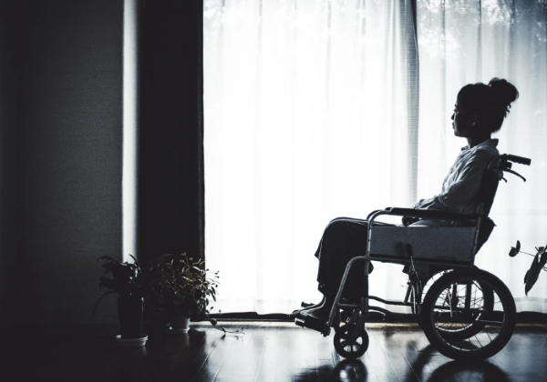La donna è ritratta di profilo davanti a una grande finestra luminosa coperta da una tenda leggera. L’ambiente circostante è scuro, con la luce che proviene principalmente dalla finestra, creando un forte contrasto. Sul lato sinistro dell’immagine sono visibili due piante in vaso. L’atmosfera generale è contemplativa o solitaria.