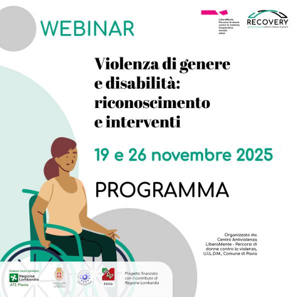 UILDM-Pavia-seminari-violenza-donne-2025-volantino Essa contiene gli estremi dell’iniziativa ed è illustrato col disegno stilizzato di una sedia a rotelle.