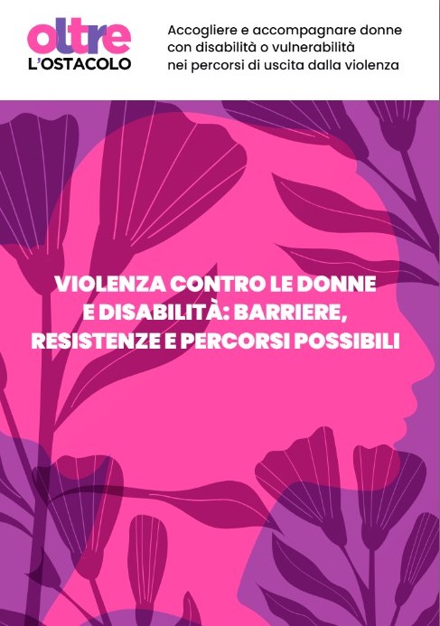 Essa contiene un riferimento al progetto “Oltre l’ostacolo. Accogliere e accompagnare donne con disabilità o vulnerabilità nei percorsi di uscita dalla violenza”, ed è illustrata con un disegno astratto realizzato con una combinazione di colori vivaci, prevalentemente rosa acceso e diverse tonalità di viola. Il design è grafico, con sagome stilizzate di fiori e foglie che si sovrappongono a una silhouette di profilo del volto di una donna.